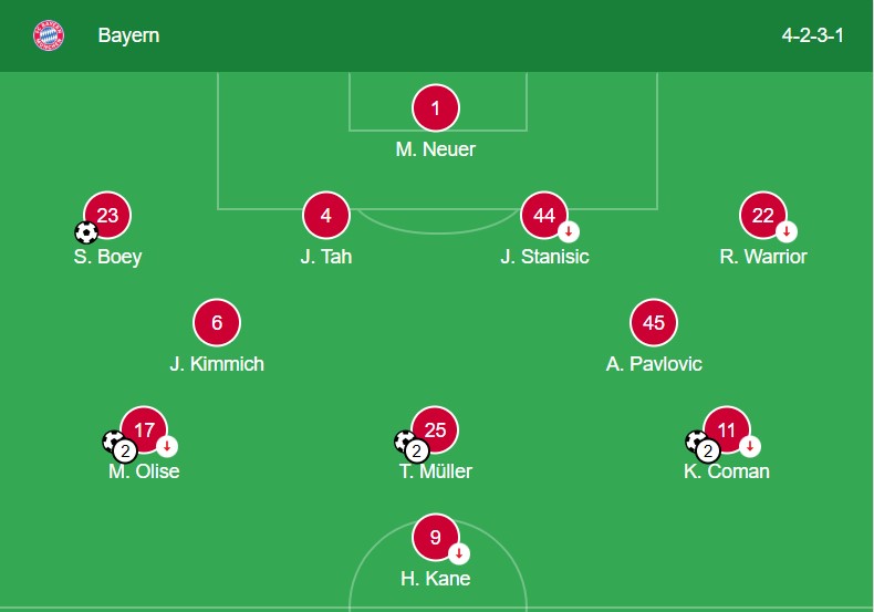 At the 45th minute, Olise crossed from the right and Thomas Müller ghosted into the box to volley into the top right 5-0.