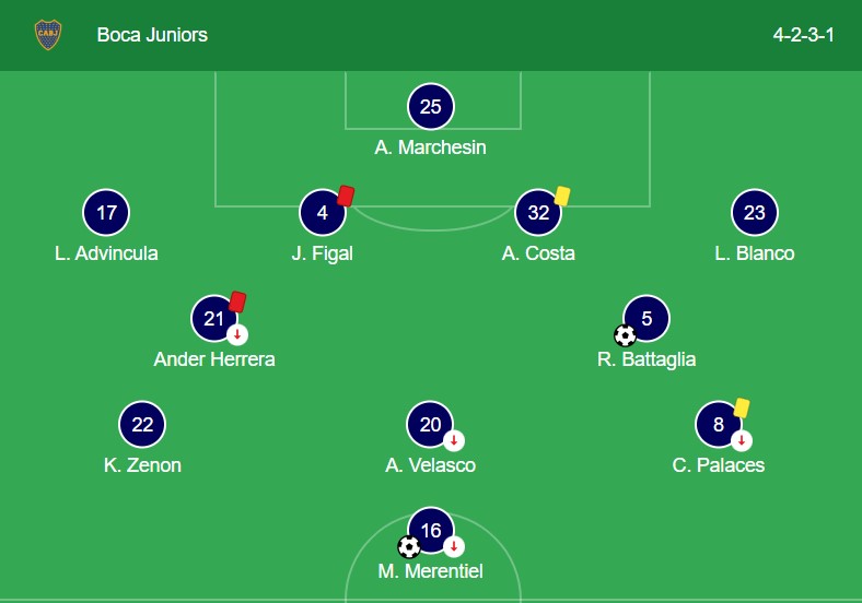 Boca Juniors played a compact 4-4-2, with Battaglia and Belmonte solid in midfield, and Merentiel as the central striker. Defensively, the team held its shape well until set-piece errors led to goals.