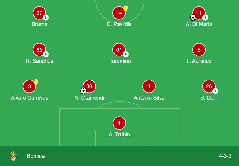 Benfica used a fluid 4-2-3-1, with Di María drifting between lines and Bruma stretching play wide. After Belotti’s red card, Pavlidis dropped deeper to balance the midfield.