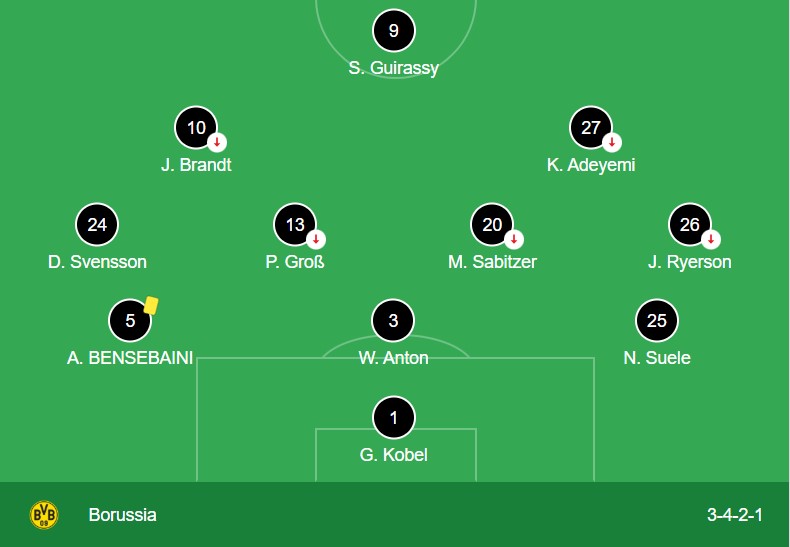 Under Kovač, Dortmund deployed a 3-4-2-1 system. Pascal Groß and Marcel Sabitzer formed a double pivot in midfield, but struggled to feed forwards Adeyemi and Guirassy effectively.