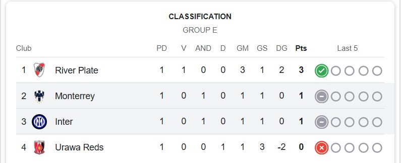 With this draw, Monterrey and Inter Milan each collect 1 point, while River Plate leads the group with 3 points after defeating Urawa Reds 3-1.