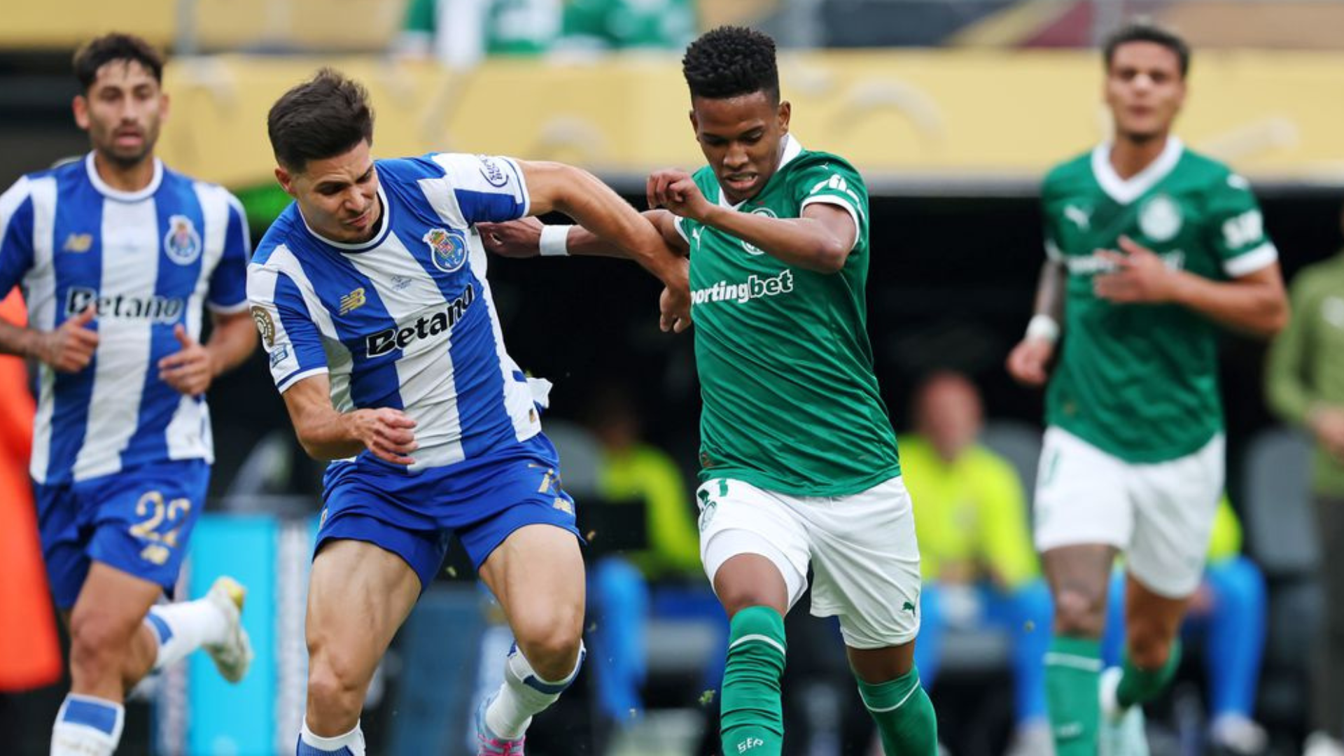 After a Porto corner, Martim Fernandes headed toward goal, but Weverton made the save. Palmeiras immediately countered, with Vitor Roque nearly scoring before being denied by Zé Pedro’s block.
