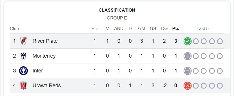 With this win, River Plate takes the top spot in Group E with 3 points, ahead of Monterrey and Inter Milan, who drew 1-1. Urawa Red Diamonds, with no points, now sits at the bottom of the group and faces a must-win situation.